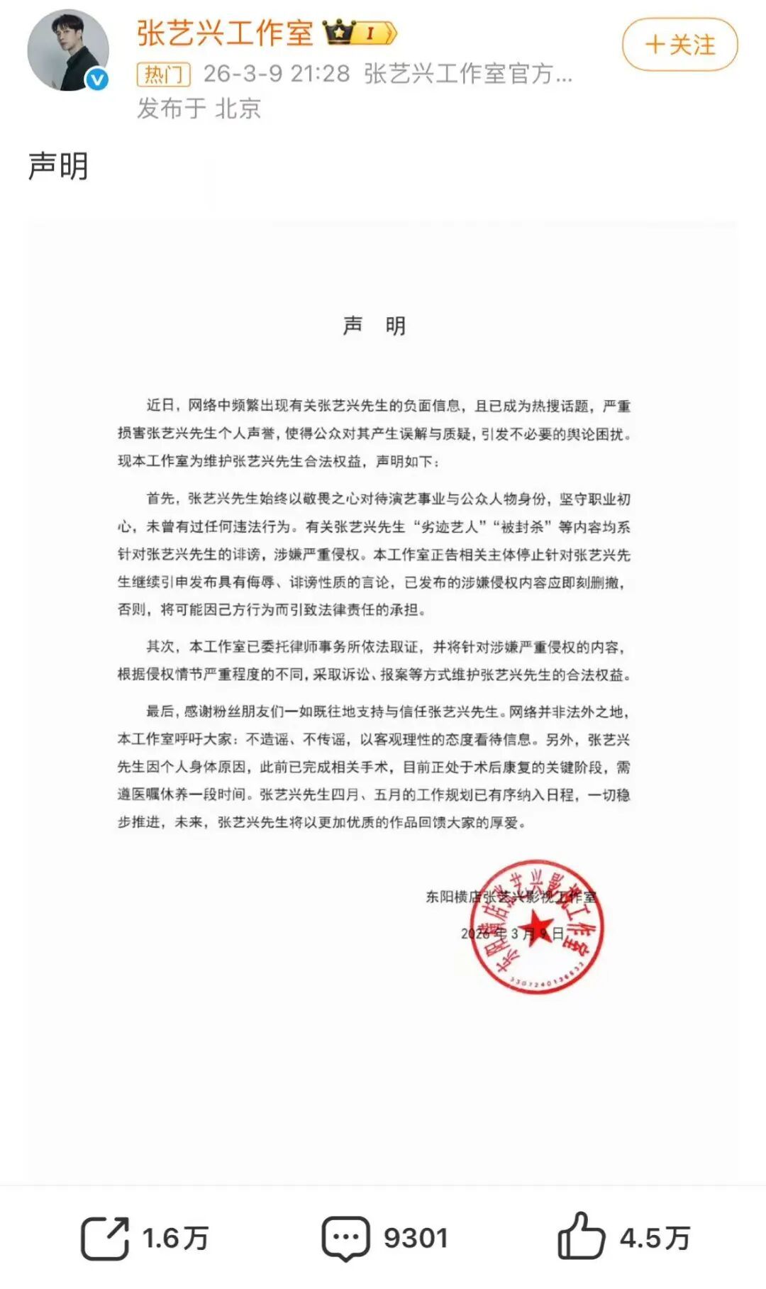 今晚(3月9日),张艺兴工作室发声明回应近日关于“被封杀”“国家话剧院”等热议。